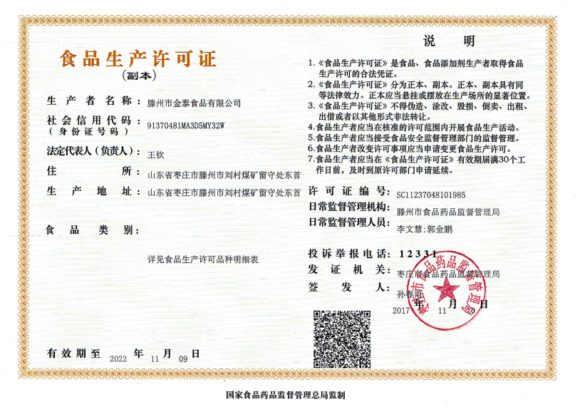 滕州市金泰食品股份有限公司是滕州一家大型民營企業,成立于2017年1月,法人石圣,企業坐落于山東省滕州市劉村煤礦院內,占地30畝,個人獨資企業,現有員工50人,注冊資金800萬元。年生產能力10萬噸,產值2.4億元。